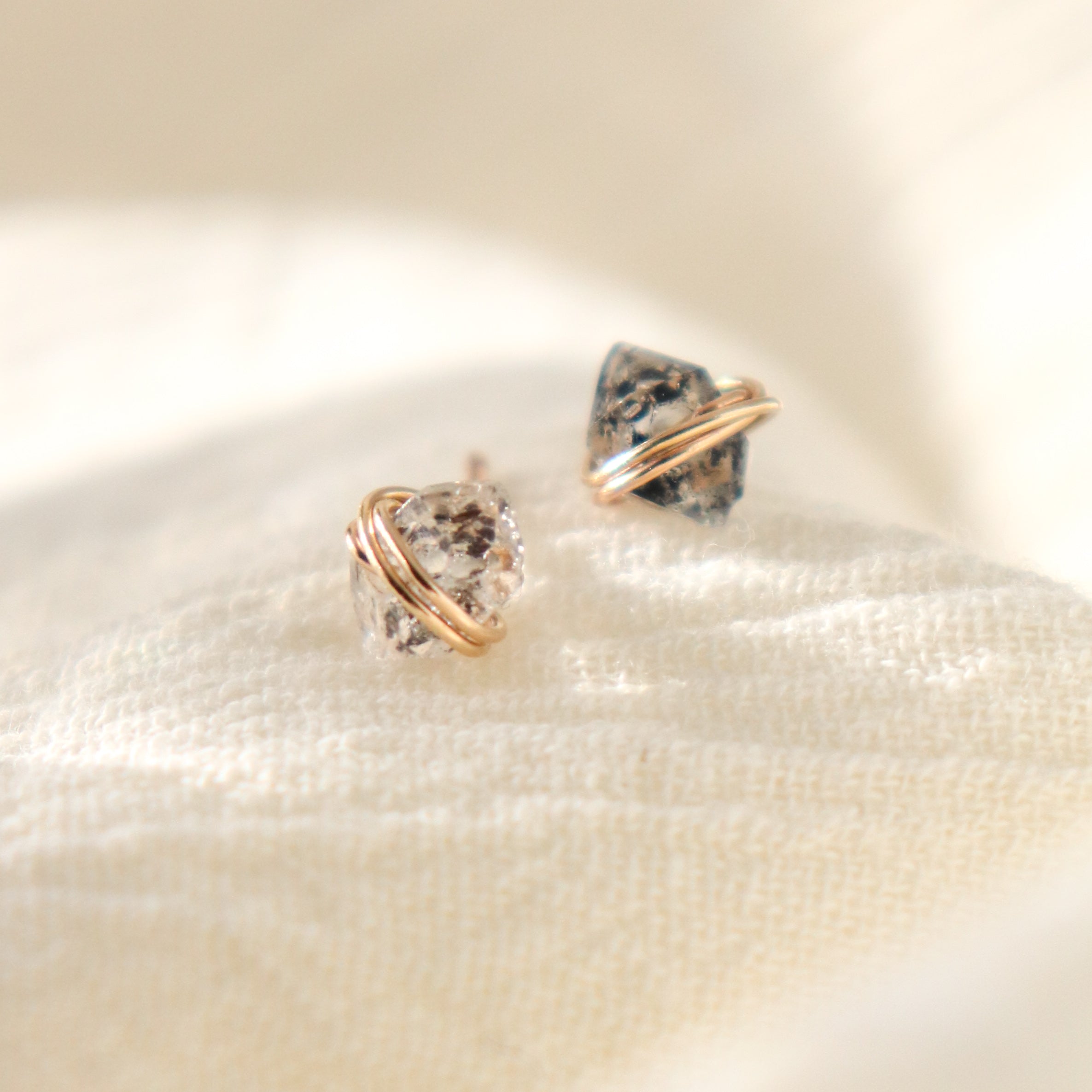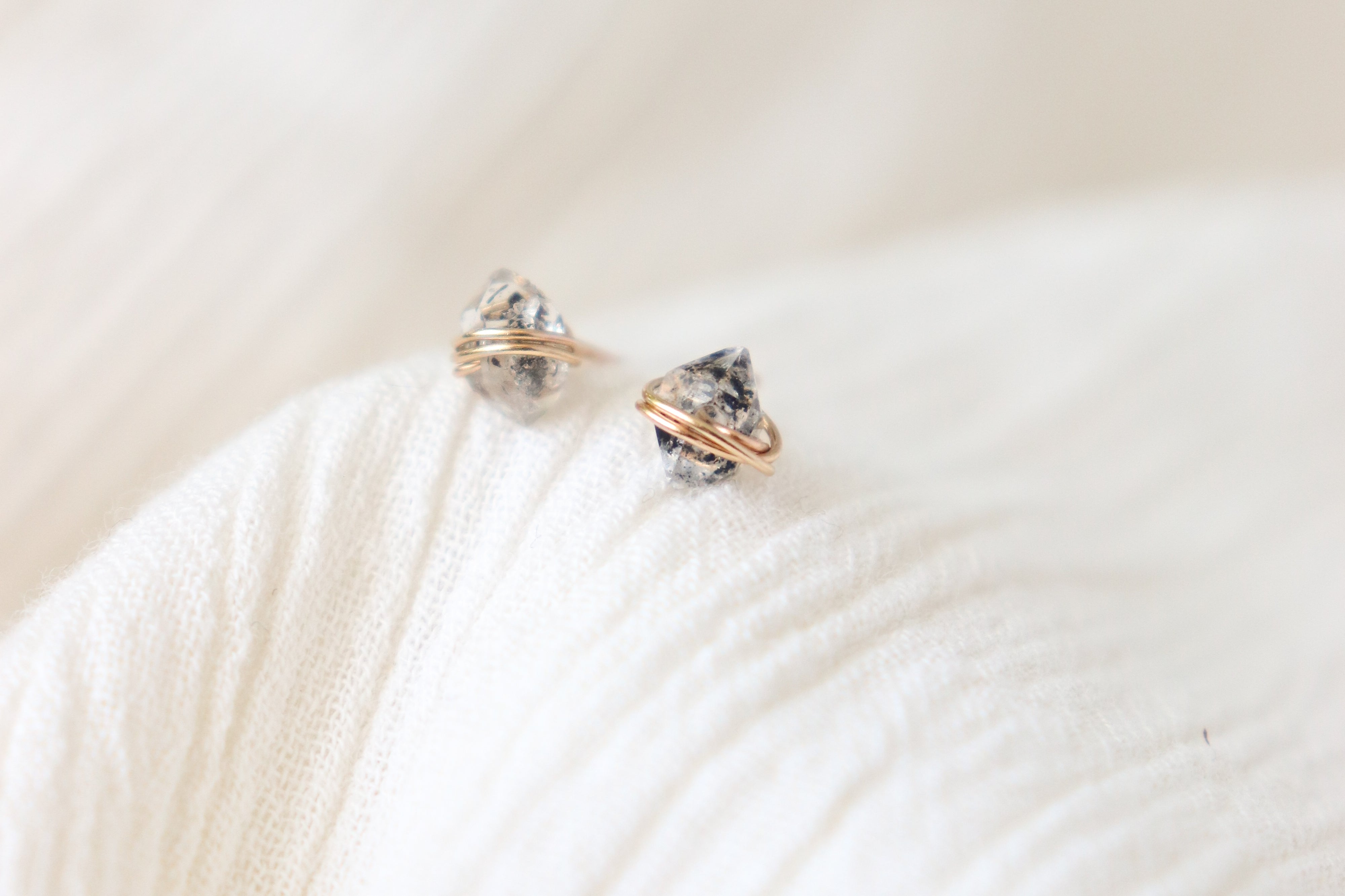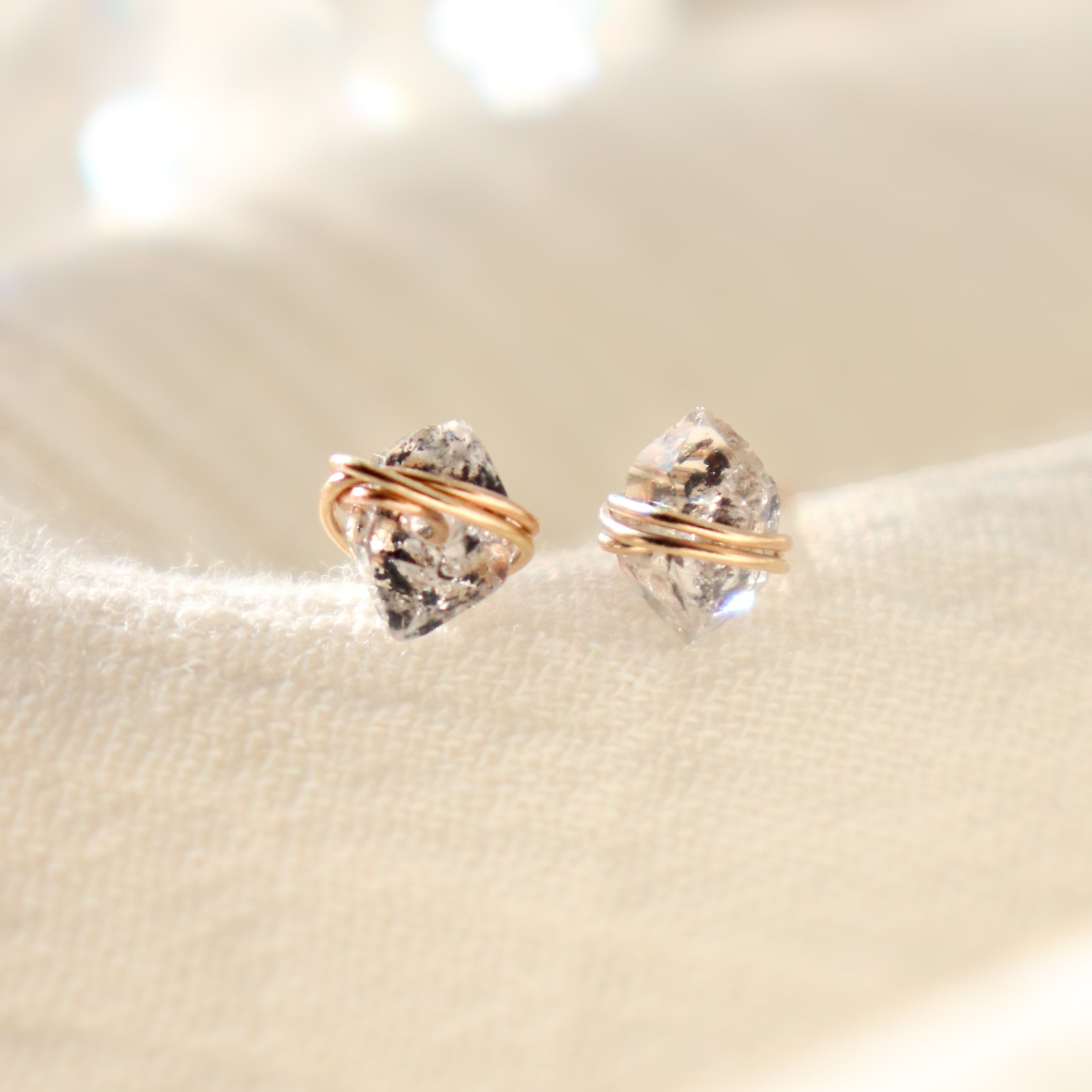 These stunning Herkimer Diamonds come out of the ground looking exactly this gorgeous! Herkimer Diamond is an extra-hard type of quartz that is naturally double terminated with 18 faceted sides, regardless of stone size. We source the clearest Herkimers for extra sparkle. Some have black anthraxolite inclusions, too. We're obsessed; all the variations make each pair extra unique and interesting! We've meticulously matched our Herkimers to create earring pairs. Sets will vary slightly in size and shape from one pair to the next.