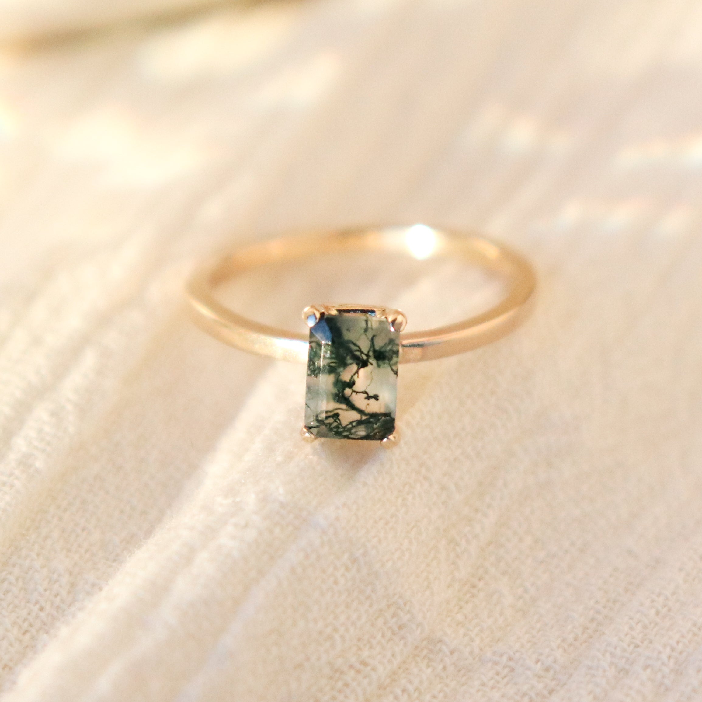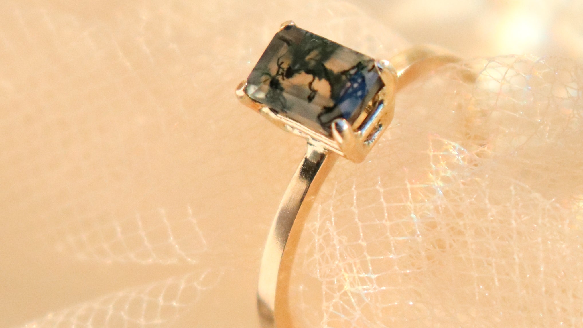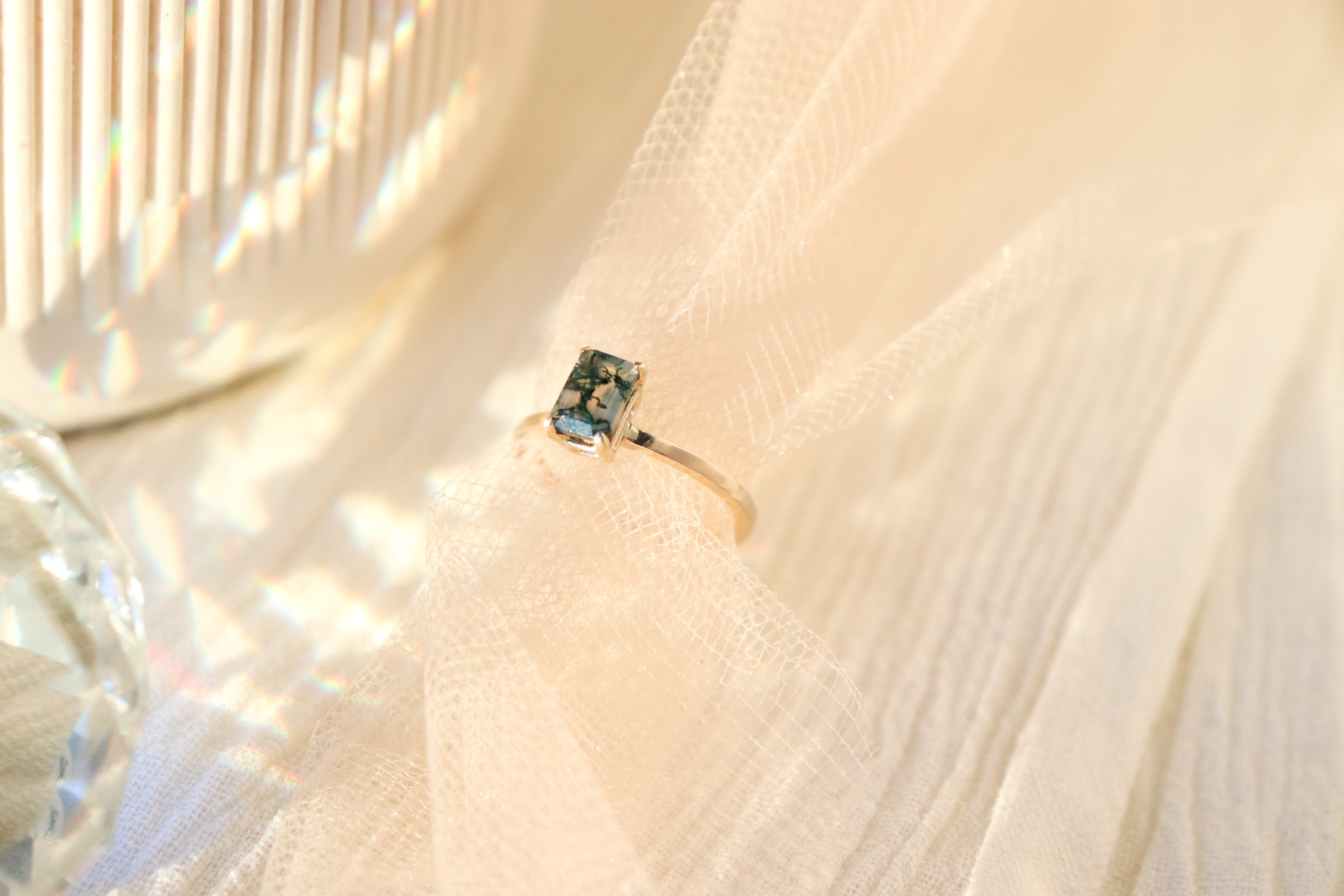 One of our best sellers! Moss agate is known to be grounding, balancing and promotes abundance. Moss agate is an alternative May birthstone. This is also the perfect stone for the Gemini, Aquarius or Virgo. Most closely associated with the heart chakra, moss agate is said to usher in abundance and balance extreme emotions. Perfect as a unique engagement ring!