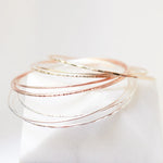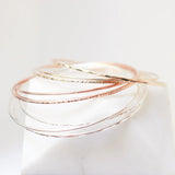 A set of three, slim, handmade bangles can be worn as a simple statement or stacked with multiples. Choose the textured finishes you would like - stardust sparkle texture, pebbled, smooth, twist or square. Or, let us surprise you with our favorites!