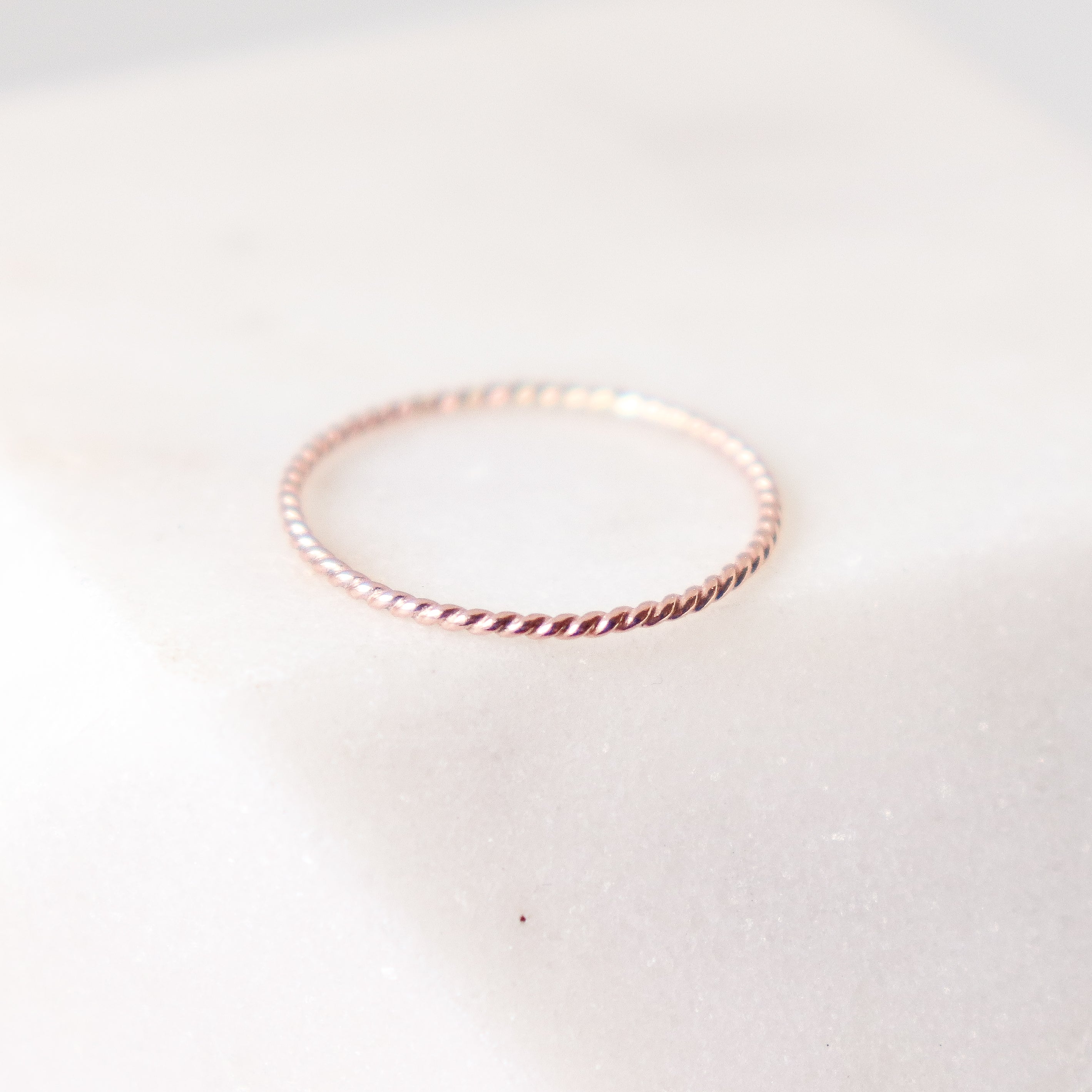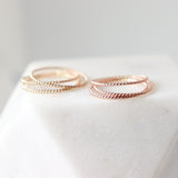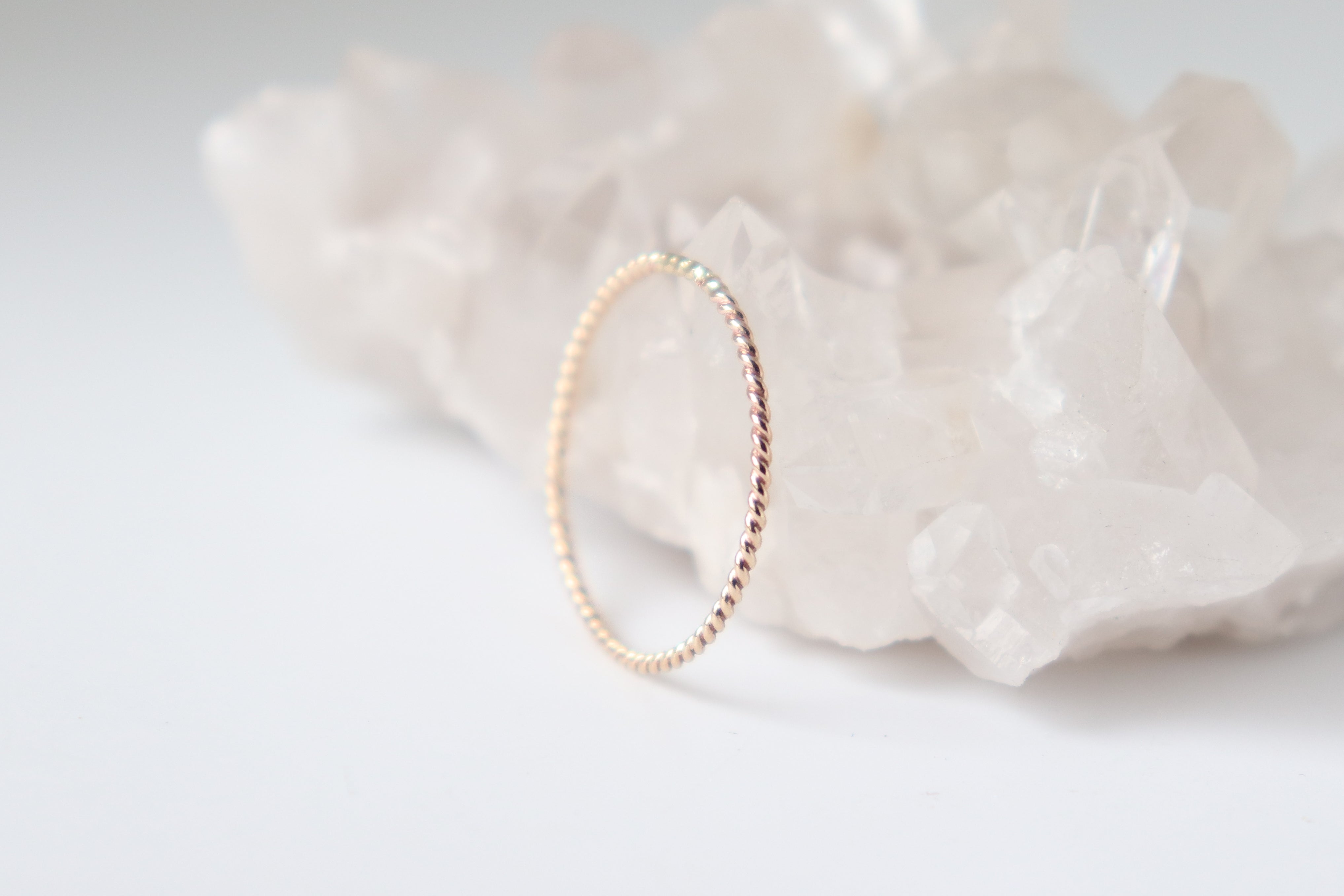Our dainty, textured twist or rope style band adds a layer of interest and sparkle to your stack! For the forever minimalist at heart. Explore all of our stackable rings, handmade to order in an array of precious metals, textures, band widths and sizes.