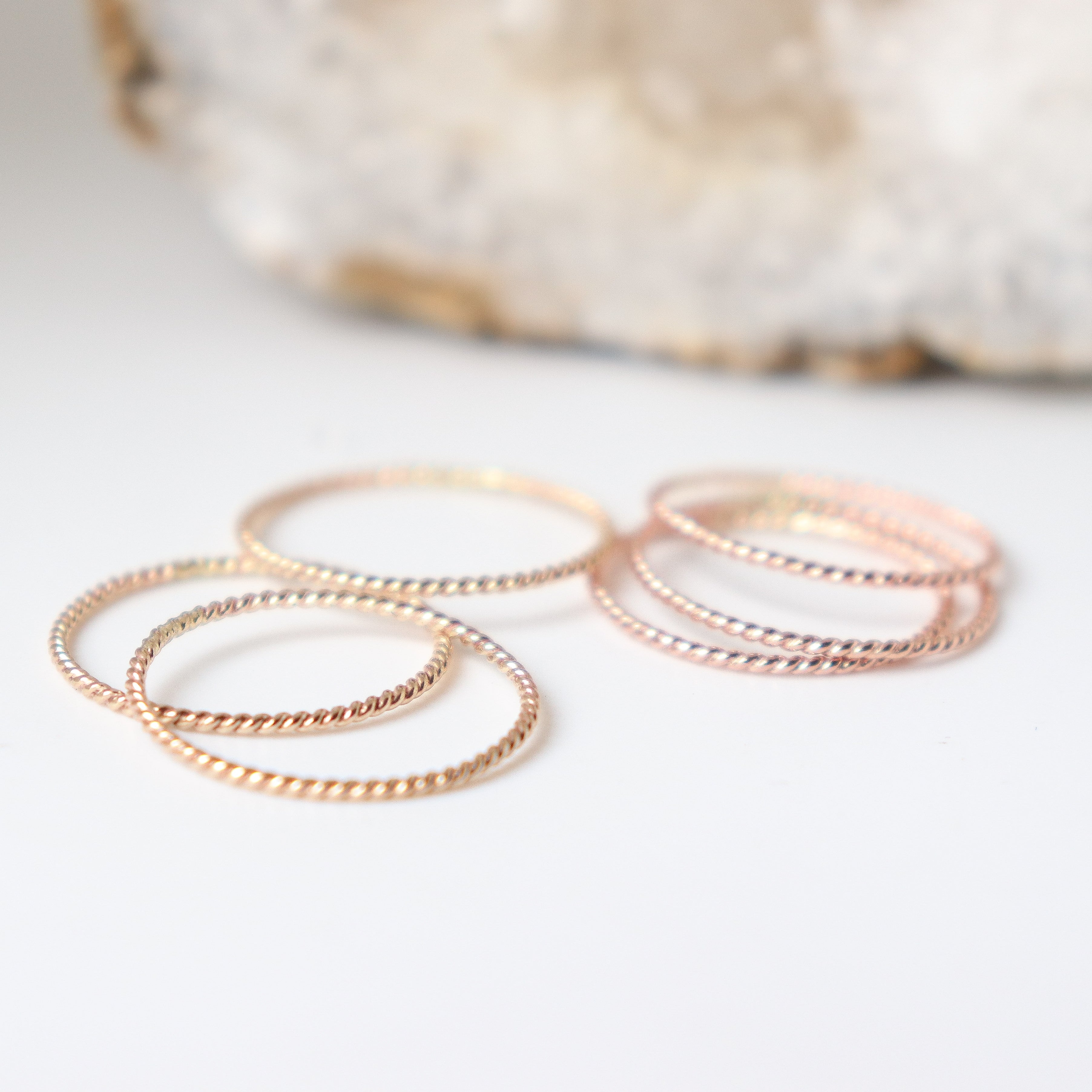 Our dainty, textured twist or rope style band adds a layer of interest and sparkle to your stack! For the forever minimalist at heart. Explore all of our stackable rings, handmade to order in an array of precious metals, textures, band widths and sizes.